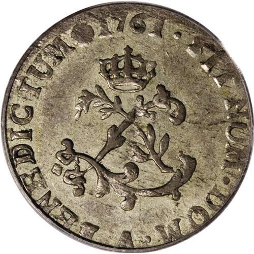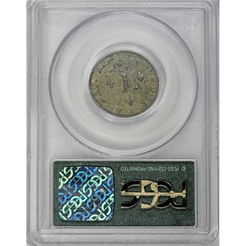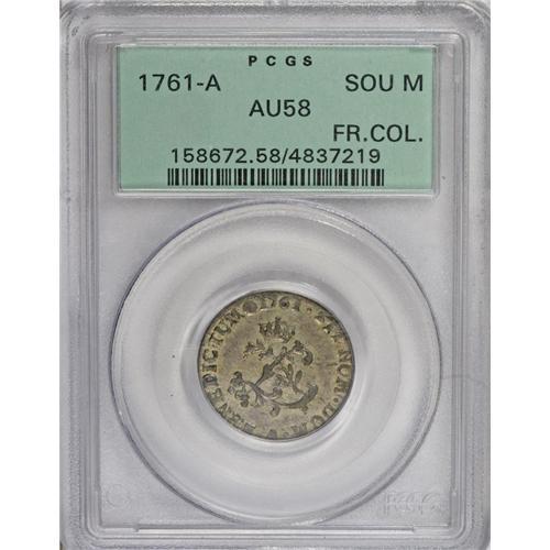 <B>1761-A SOU M French Colonies Sou Marque AU58 PCGS.</B></I> Second Semester. Breen-420, "Extremely rare." Vlack-45a, R.6. Substantial luster glimmers beneath the dusky silver-gray and olive surfaces. Smooth save for minor laminations and occasional peripheral incompleteness of strike. Currently the only 1761-A Sou Marque certified by PCGS (10/06). Housed in an old green label holder. Listed on page 51 of the 2007 <I>Guide Book.</B></I><BR><I>From The Cocoa Beach Collection.</B></I><BR><BR><b>Shipping:</b> Coin/Currency (<a target="_blank" href="http://www.heritageauctions.com/common/shipping.php">view shipping information</a>)