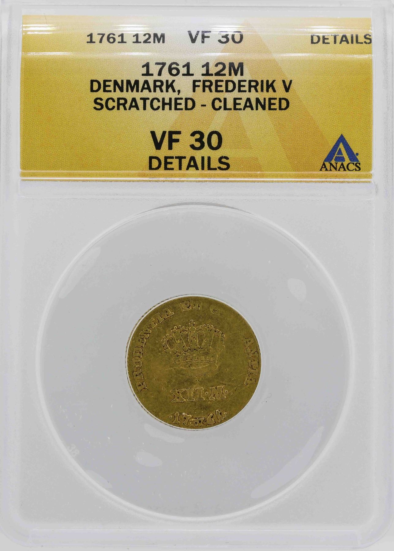 One 1761 Denmark Fredrik V 12 Mark Coin ANACS VF30 Details.