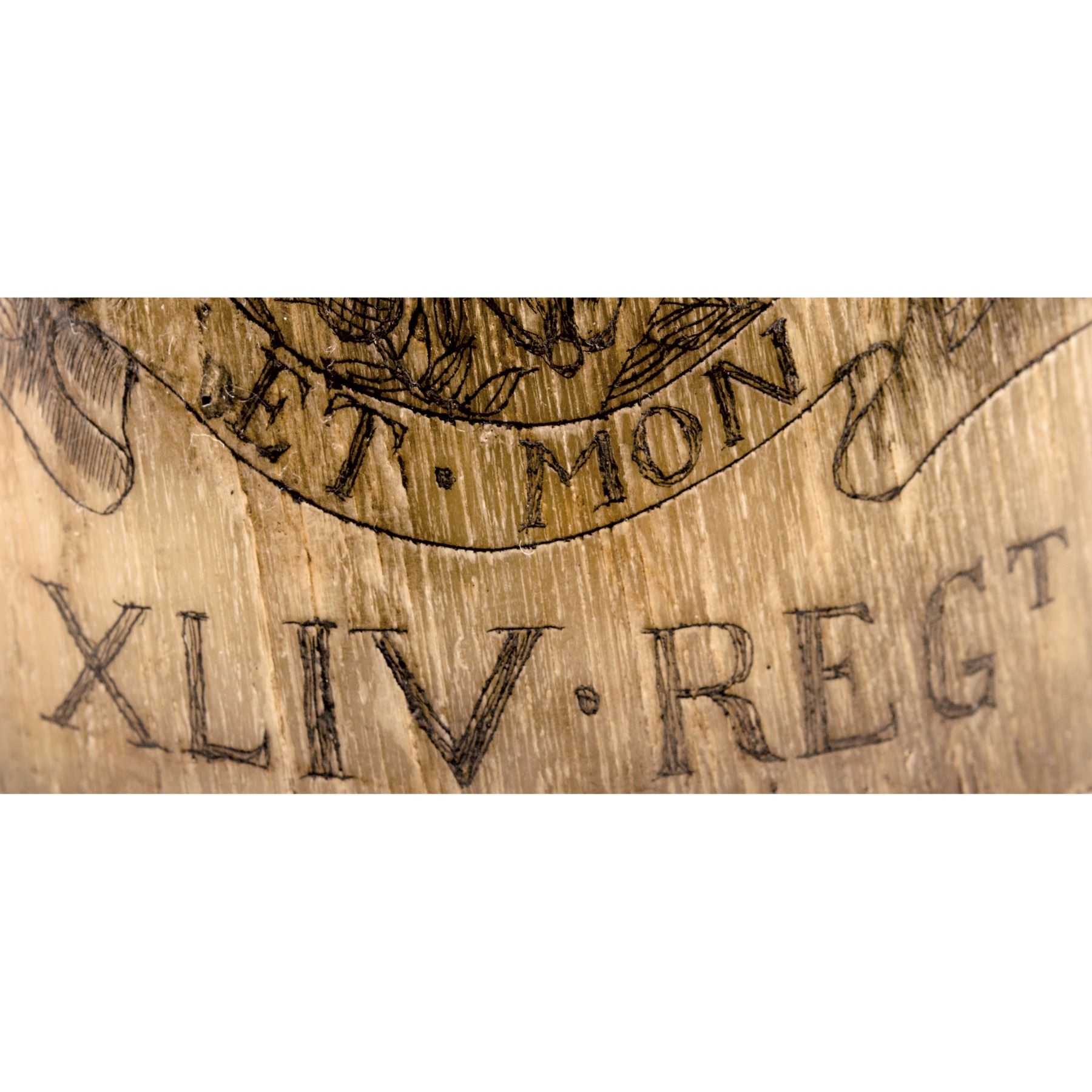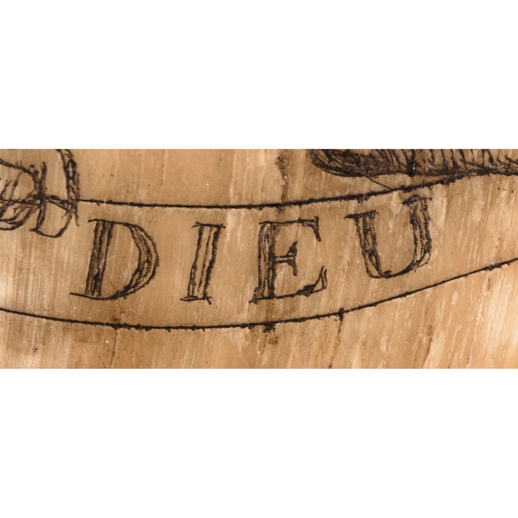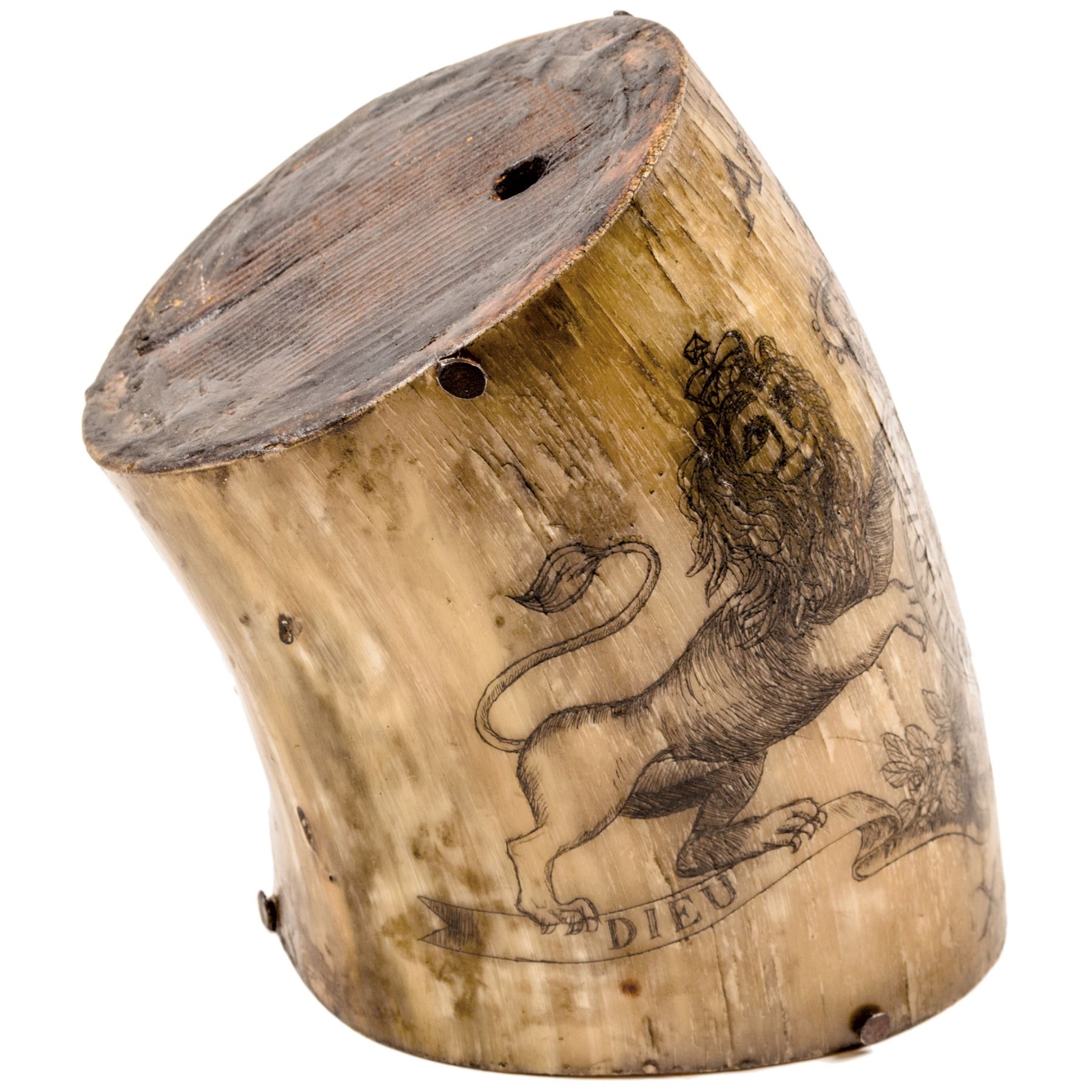 1761-Dated French and Indian War Period, Important Hand-Engraved Decorative Horn, Powder Horn made “Personal Container” made from 6” tall and 4.5” wide which was typically used as a method for transporting smaller quantities of goods such as Powder, Sugar, Salt, Rum, etc.. The top and bottom wooden cap ends are sealed and nailed with period blacksmith made small round flat head nails. It is ornately Hand-Engraved with British Crest with a Crowned Lion, and Chained Unicorn vignettes on either side of a Crowned Circular Banner with the engraved text legends: “Honisoit Quimal Ypense” and “Dieu Et Mon Droit” below. Identified to the “XLIV” of 44th Regiment of Foot. Similar to examples listed on Pages 154 & 155 of “Collector’s Illustrated Encyclopedia of the American Revolution” by Neumann & Kravic. "Honi soit qui mal y pense" are French words that are often found on Britain's Royal Coat of Arms. Its basic translation is meant to covey, "Shame on the one who sees something bad (or evil) in it." “Dieu et mon droit” meaning is “God and my right” which is the motto of the Monarch of the United Kingdom outside Scotland. It usually appears on a scroll beneath the shield of the version of the Coat of Arms. This Horn Container has extensive decoration and provenance to a British Regiment that saw lots of military action in 1761 and throughout the French and Indian War Period. There is honest actual wear and has some traces of powder? within the container. The engraving remains very clear in detail with deep brown scrimshaw designs. An excellent example for any collection period display.