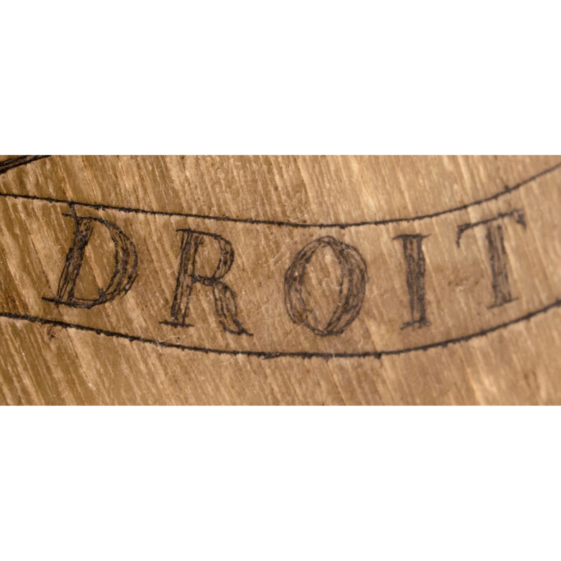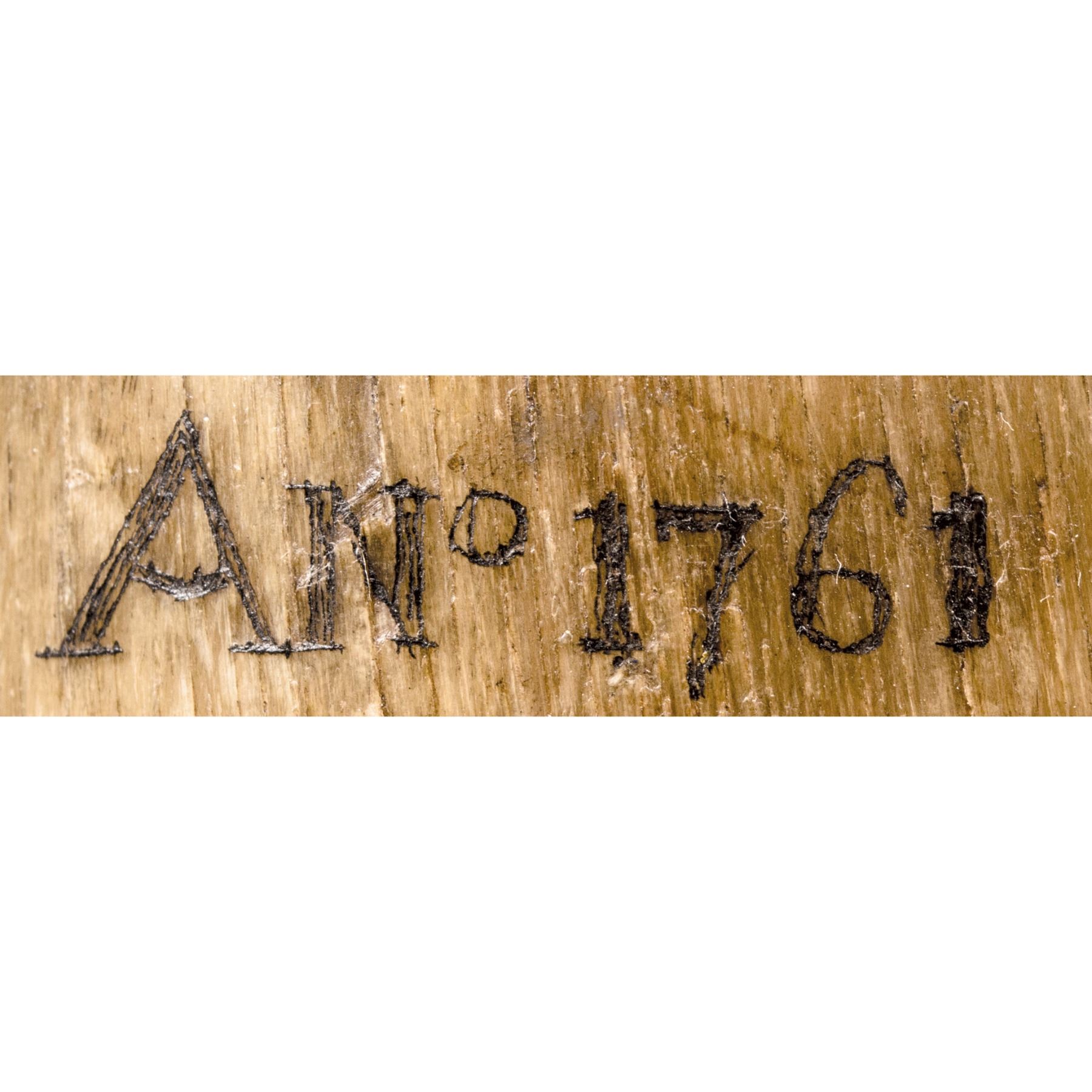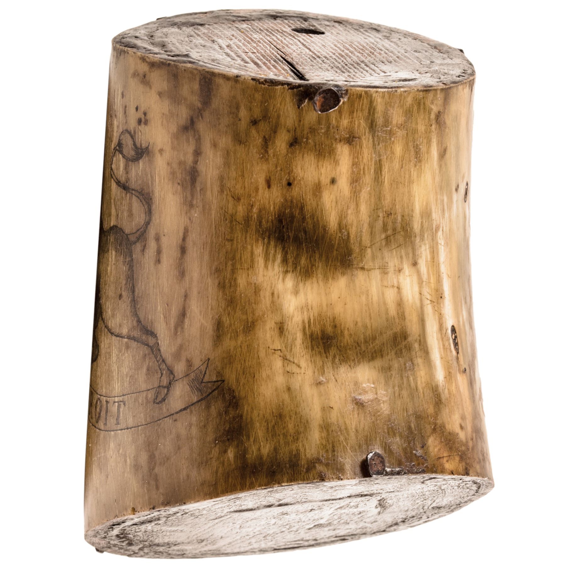 1761-Dated French and Indian War Period, Important Hand-Engraved Decorative Horn, Powder Horn made “Personal Container” made from 6” tall and 4.5” wide which was typically used as a method for transporting smaller quantities of goods such as Powder, Sugar, Salt, Rum, etc.. The top and bottom wooden cap ends are sealed and nailed with period blacksmith made small round flat head nails. It is ornately Hand-Engraved with British Crest with a Crowned Lion, and Chained Unicorn vignettes on either side of a Crowned Circular Banner with the engraved text legends: “Honisoit Quimal Ypense” and “Dieu Et Mon Droit” below. Identified to the “XLIV” of 44th Regiment of Foot. Similar to examples listed on Pages 154 & 155 of “Collector’s Illustrated Encyclopedia of the American Revolution” by Neumann & Kravic. "Honi soit qui mal y pense" are French words that are often found on Britain's Royal Coat of Arms. Its basic translation is meant to covey, "Shame on the one who sees something bad (or evil) in it." “Dieu et mon droit” meaning is “God and my right” which is the motto of the Monarch of the United Kingdom outside Scotland. It usually appears on a scroll beneath the shield of the version of the Coat of Arms. This Horn Container has extensive decoration and provenance to a British Regiment that saw lots of military action in 1761 and throughout the French and Indian War Period. There is honest actual wear and has some traces of powder? within the container. The engraving remains very clear in detail with deep brown scrimshaw designs. An excellent example for any collection period display.