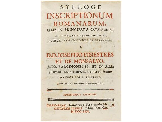 1762., LIBRO: (CATALUNYA),. FINESTRE, JOSEPHO,. SYLLOGE INSCRIPTIONUM ROMANARUM QUAE IN PRINCIPATU CATALAUNIAE,. Cerveriae: Typis Academicis Antoniam Ibarra, 1762. 8º mayor. 16 h. + 328 p., 8 h. Portada a dos tintas. Mancha en el margen superior de las primeras 130 p., papel muy débil. Enc. en pergamino.