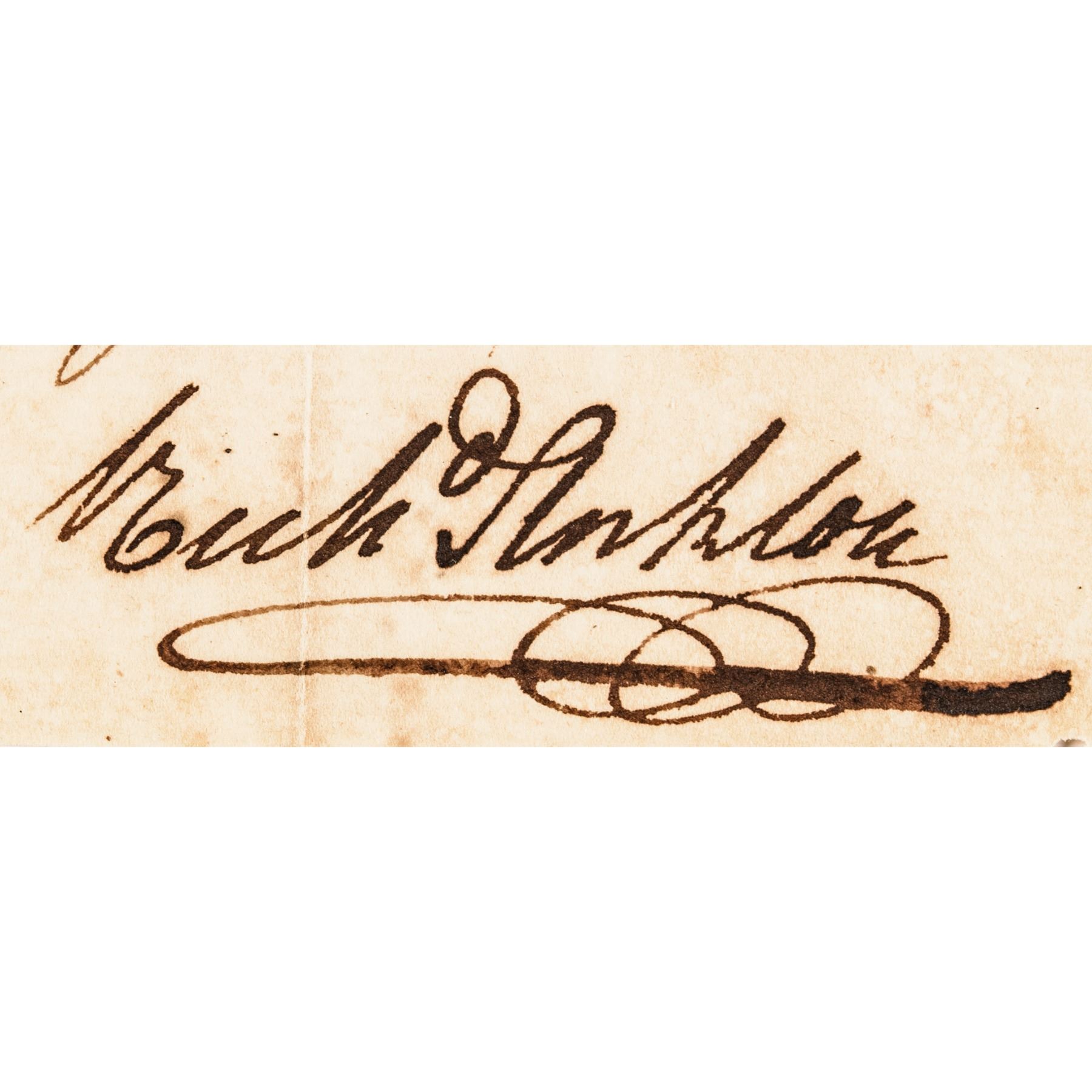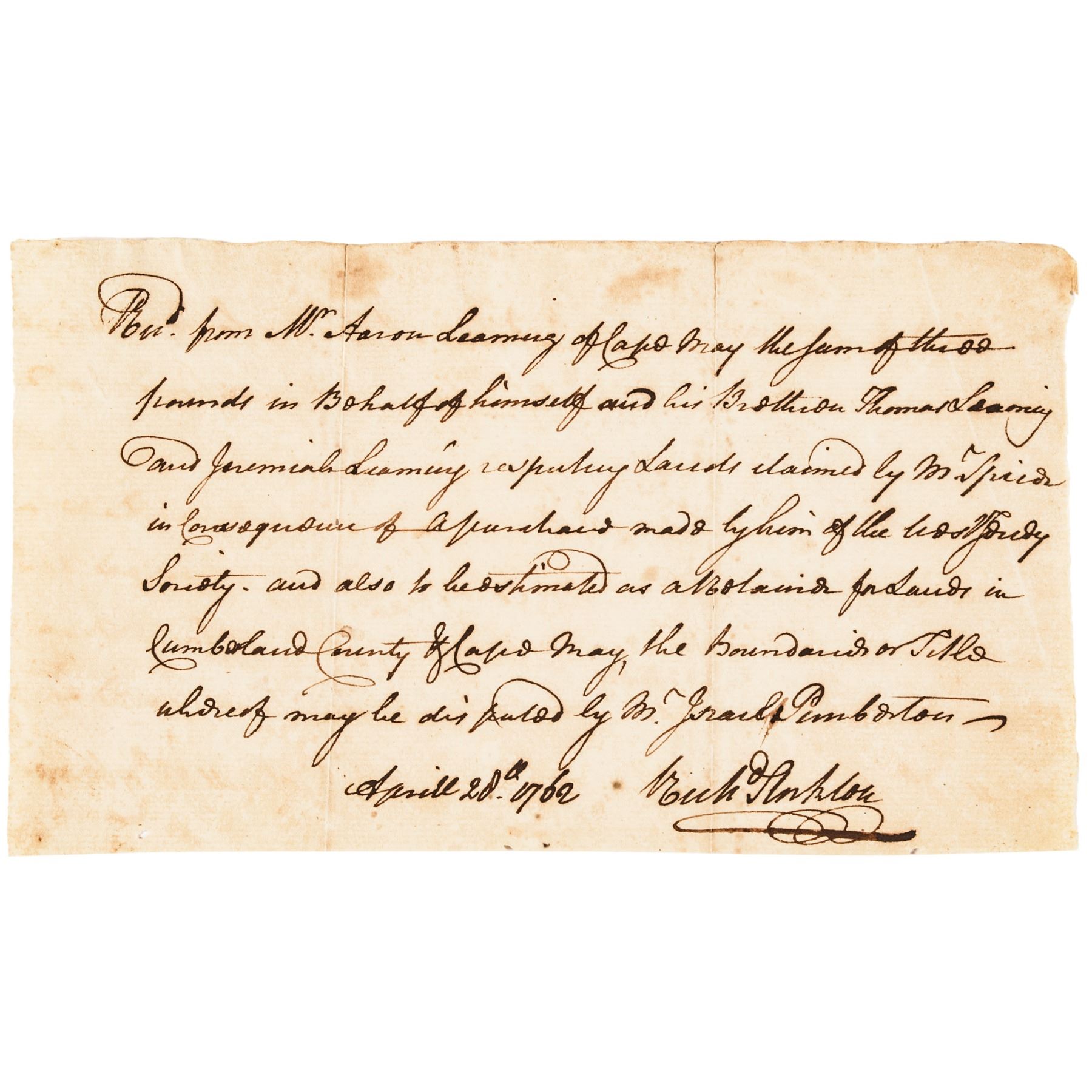 April 2, 1762-Dated Colonial, French and Indian War Period, Autograph Document Signed, “Rich. Stockton” being a Receipt fully Handwritten by Stockton on fine laid period paper measuring 4.5” x 8”, at Cape May, Cumberland County (NJ), Choice Very Fine. This entire document is clean and pleasing, written by Stockton’s own hand in deep bold brown, being easily readable. It is Signed by him at lower right. This fiancial note relates to monies received relative to land in Cape May. Stockton’s signature is bold and he completes it with a an almost 2” flourish below. Stockton is one of the rarer, less noticed “Signers,” hence his signature is more valuable and sought-after as a Signer of the Declaration of Independence.