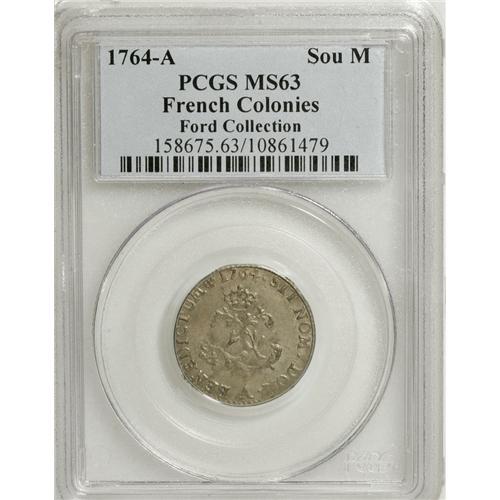 <B>1764-A SOU M French Colonies Sou Marque MS63 PCGS.</B></I> Vlack-38. Ex: Ford Collection. Well struck with rose-gray and forest-green patina over each side. Select with strong eye appeal. Listed on page 51 of the 2007 <I>Guide Book.</B></I> Population: 3 in 63, 0 finer (4/07).<BR><BR><b>Shipping:</b> Coins & Currency (<a target="_blank" href="http://www.heritageauctions.com/common/shipping.php">view shipping information</a>)