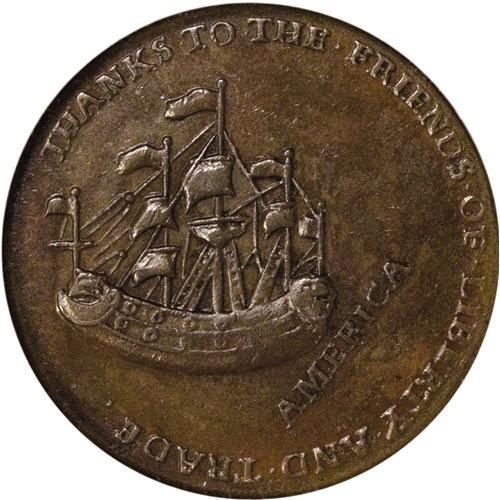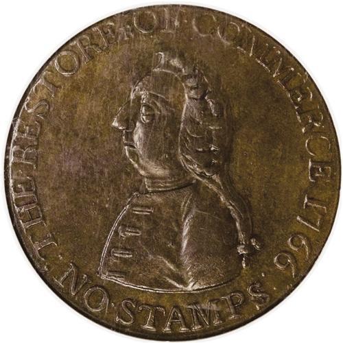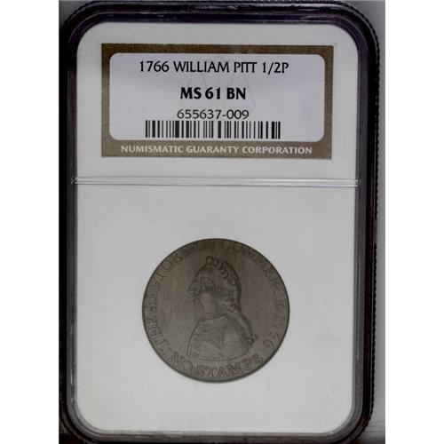 <B>1766<1/2P> Pitt Halfpenny MS61 Brown NGC.</B></I> Breen-251. Sir William Pitt became a hero to merchants on both sides of the Atlantic in 1766, when his opposition to the hated Stamp Act resulted in its remission. This lovely golden-brown representative is well centered and nicely struck. Evaluation beneath a strong lens locates a couple of minor marks, but the eye appeal is superior for the third party grade. Listed on page 48 of the 2007 <I>Guide Book.</B></I>