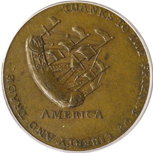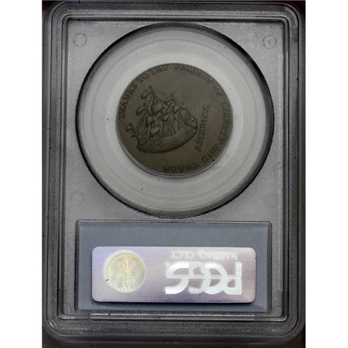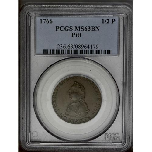 <B>1766<1/2P> Pitt Halfpenny MS63 Brown PCGS.</B></I> Breen-251, Betts-519. A splendid chocolate-brown example of this popular Early American token. Thorough evaluation fails to locate any grade-limiting marks or carbon. A subtle gray spot above the middle right side flag is mentioned solely to provide a pedigree identifier. Crisply struck, with slight softness only near Pitt's covered ear. Known as "The Great Commoner," Sir William Pitt spoke in Parliament against the Stamp Act, a tax on the colonies that in effect limited publications and restricted the freedom of the press. The hated Stamp Act was repealed in 1766, and the Pitt farthings and halfpennies were issued shortly later. The maker of these tokens is unknown. Although Breen believed it to be an American-struck issue, it could also have been produced in England by a grateful exporter. Listed on page 48 of the 2007 <I>Guide Book.</B></I>