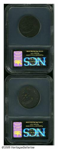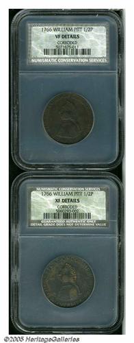 <B>1766<1/2P> Pitt Halfpenny VF Details, Corroded, NCS,</B></I> Breen-251, only mildly granular, medium lavender-brown toning, some weakness of strike on FRIENDS OF LIBERTY; and a <B>1766 Pitt Halfpenny, XF Details, Corroded, NCS,</B></I> Breen-251, possibly silvered, golden-brown highlights but mostly deep grainy steel-gray in color, types and legends are clear. Listed on page 35 of the 2005 <I>Guide Book.</B></I>