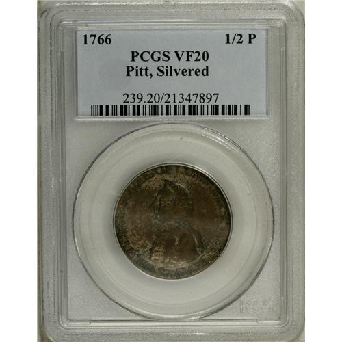<B>1766 1/2P Pitt Halfpenny VF20 PCGS.</B></I> Breen-251. A silvered example, although the majority of the silver plate has worn through and the piece is now mostly tan-brown in color. The legends are generally clear. The chin has a pair of wispy abrasions, otherwise problem-free for the grade. Listed on page 48 of the 2007 <I>Guide Book.</B></I><BR><BR><b>Shipping:</b> Coin/Currency (<a target="_blank" href="http://www.heritageauctions.com/common/shipping.php">view shipping information</a>)