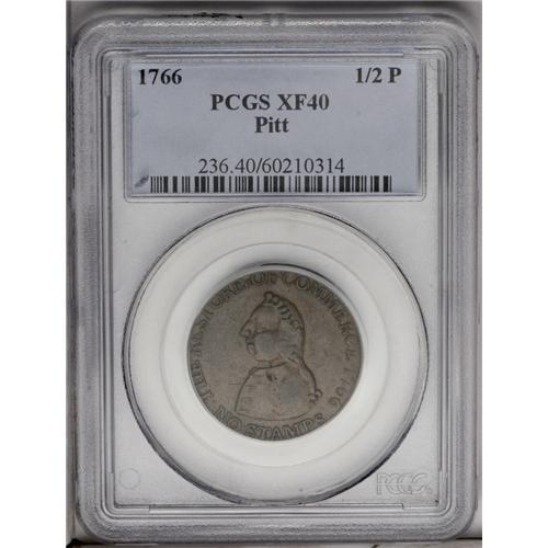<B>1766<1/2P> Pitt Halfpenny XF40 PCGS.</B></I> Breen-251. The obverse of this attractive mid-grade representative is a glossy medium brown while the reverse is a trifle off-center and shows occasional planchet roughness at the margins. Listed on page 48 of the 2007 <I>Guide Book.</B></I>