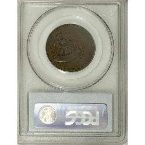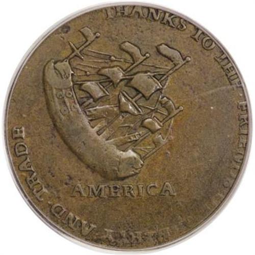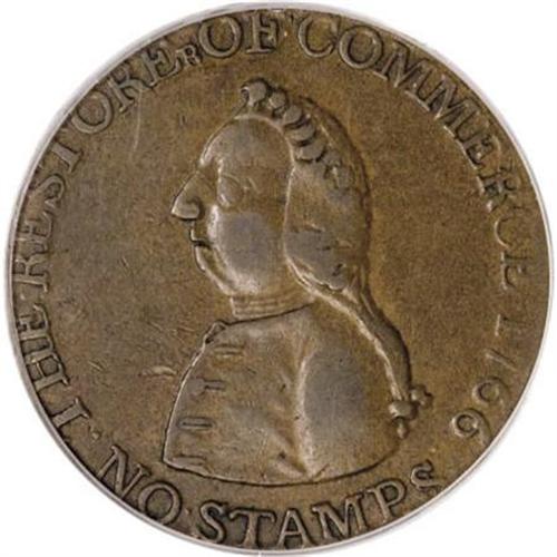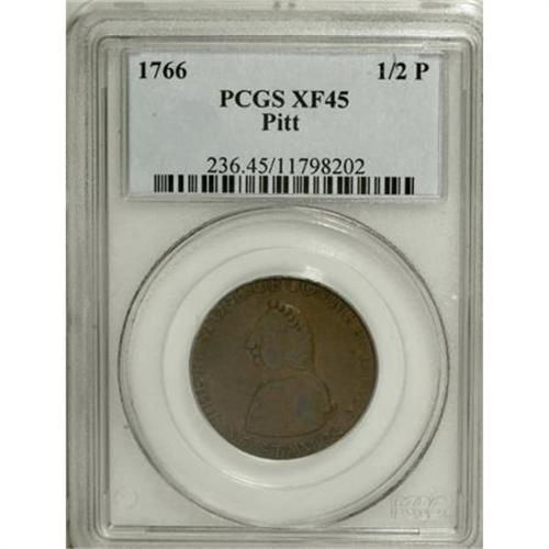 <B>1766 1/2P Pitt Halfpenny XF45 PCGS.</B></I> Betts-519, Breen-251. Sir William Pitt faces left, wearing a long wig and military garb on the obverse. The obverse legend refers to the fight against the Stamp Act that was intended to restrict free trade: THE RESTORER OF COMMERCE 1766, above, and NO STAMPS, below. The reverse legend continues the same theme: AMERICA, THANKS TO THE FRIENDS OF LIBERTY AND TRADE.<BR> It is believed that these pieces were produced in colonial America, perhaps New York or Philadelphia. Included as part of the Betts series of American historical medals, they are also actively collected as part of the colonial series. Smooth chocolate-brown surfaces are intermingled with lighter tan and darker steel color. Listed on page 48 of the 2008 <I>Guide Book</B></I>.<BR><BR><BR><b>Shipping:</b> Coins & Currency (<a target="_blank" href="http://www.heritageauctions.com/common/shipping.php">view shipping information</a>)