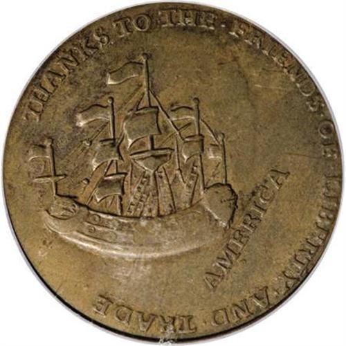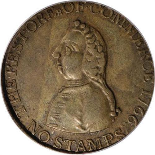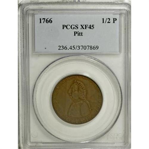 <B>1766 1/2P Pitt Halfpenny XF45 PCGS.</B></I> Breen-251, Betts-519. For the issue, this delightful Pitt halfpenny has unusually smooth, choice surfaces. Light chestnut-brown toning dominates this piece, except for the left third of the obverse, where the color ends in an abrupt line and becomes a tad darker, probably from years of storage in a cabinet tray or paper holder. William Pitt was one of America's most important political allies during the late Colonial period. This issue commemorates his successful efforts to repeal the Stamp Act. Population: 18 in 45, 39 finer (12/07).<BR><BR><b>Shipping:</b> Coins & Currency (<a target="_blank" href="http://www.heritageauctions.com/common/shipping.php">view shipping information</a>)