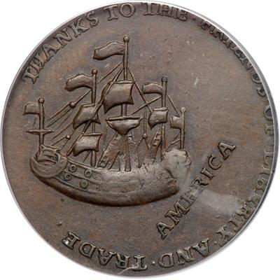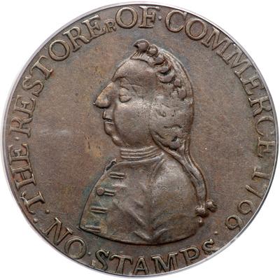 1766 Pitt Halfpenny Token Breen-251. PCGS graded AU-50. Choice frosty medium chocolate brown. Virtually flawless, void of any notable defects. Nicely struck except for minor weakness on the right half of the ship. A premium example of this popular early colonial copper, which honored William Pitt for his efforts to help repeal the Stamp Act. Pop 14; 29 finer.