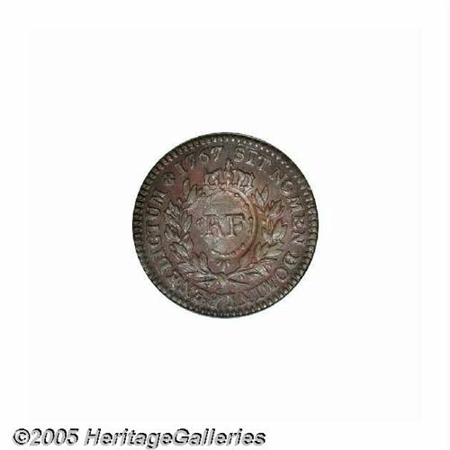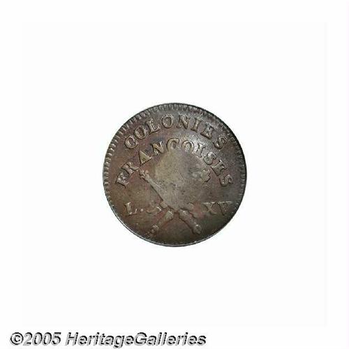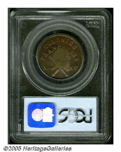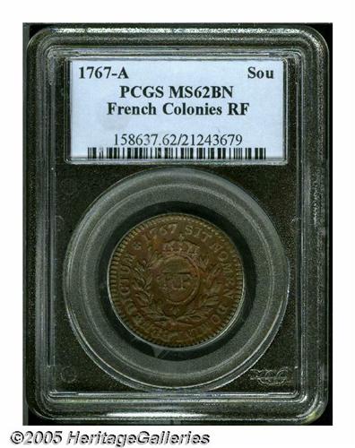 <B>1767-A<9DEN> French Colonies Copper Sou, RF Counterstamp MS62 Brown PCGS.</B></I> Breen-701. This issue was minted for the French Caribbean colonies, but not circulated until counterstamped in 1793. The currently offered example is a desirable representative that is well struck on both the host coin and counterstamp, except for the left border of the beaded rim surrounding "RF" and the reverse center opposite the counterstamp. A lustrous and glossy golden-brown representative, essentially devoid of contact aside from the counterstamp. Slightly dished from the counterstamping. This is the only example certified as counterstamped Mint State by PCGS. Listed on page 38 of the 2005 <I>Guide Book.</B></I>