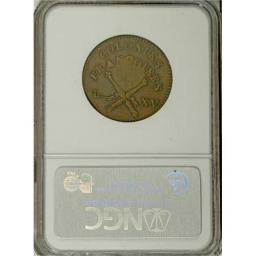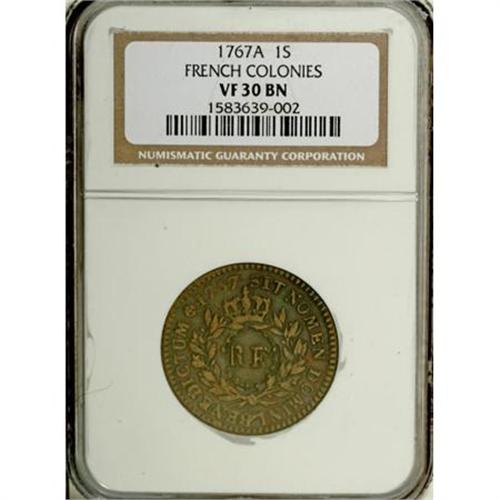 <B>1767-A 9DEN French Colonies Copper Sou, RF Counterstamp VF30 NGC.</B></I> . NGC Census: (0/0). PCGS Population (11/47). (#158637)<BR><BR><b>Shipping:</b> Coins & Currency (<a target="_blank" href="http://www.heritageauctions.com/common/shipping.php">view shipping information</a>)