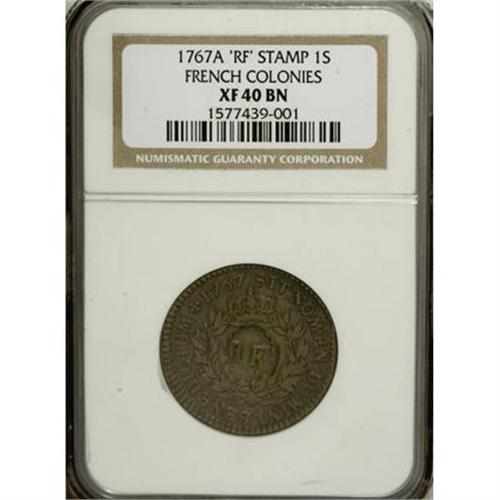 <B>1767-A 9DEN French Colonies Copper Sou, RF Counterstamp XF40 NGC.</B></I> PCGS Population (3/23). (#158651)<BR><BR><b>Shipping:</b> Coins & Currency (<a target="_blank" href="http://www.heritageauctions.com/common/shipping.php">view shipping information</a>)