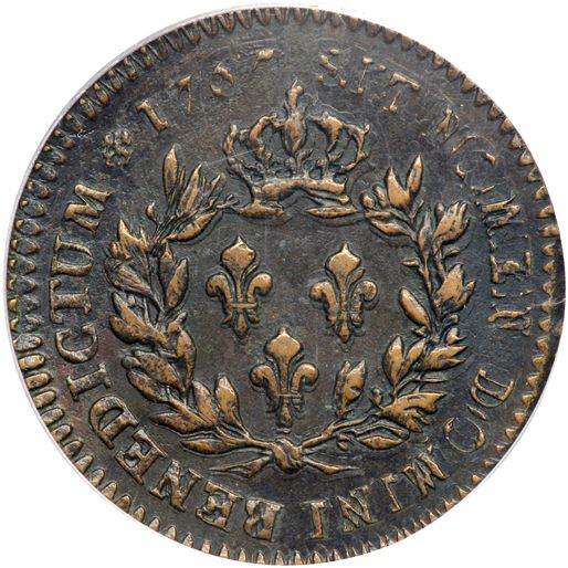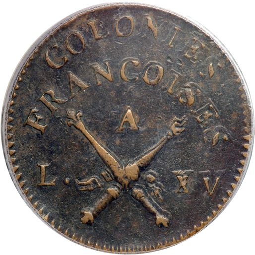 1767-A French Colonial Copper Sou Breen-700. PCGS graded EF-40. Double Struck in Collar. Glossy dark chocolate brown with lighter brown toning covering the highpoints, the contrast creating an attractive two-tone appearance that accents the designs. No marks or verdigris, but you can find traces of extremely fine roughness under strong magnification. This piece was struck two times with a tiny, no more than 1 millimeter, shift between the impressions. Sharp, clear doubling is visible on both sides. The double strike feature is noted on the PCGS label.