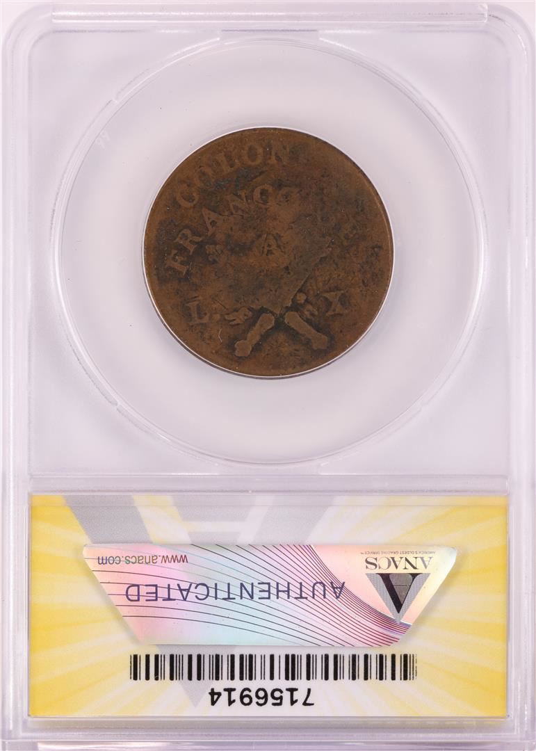 1767-A French Colonies 12 Deniers Coin ANACS F12 'RF' Countermark