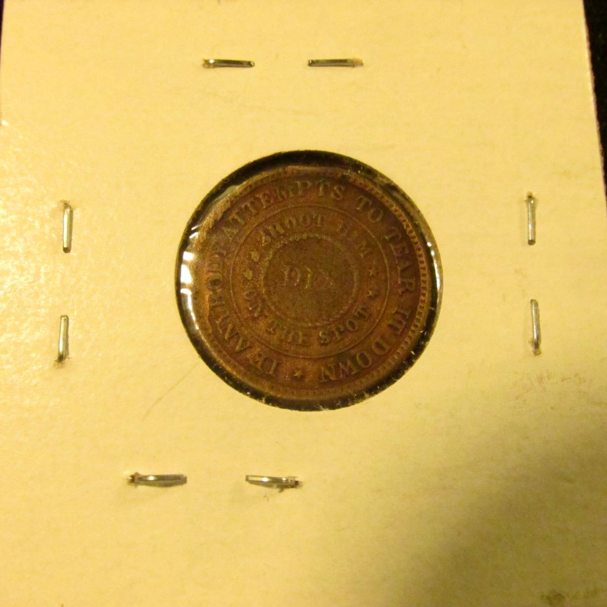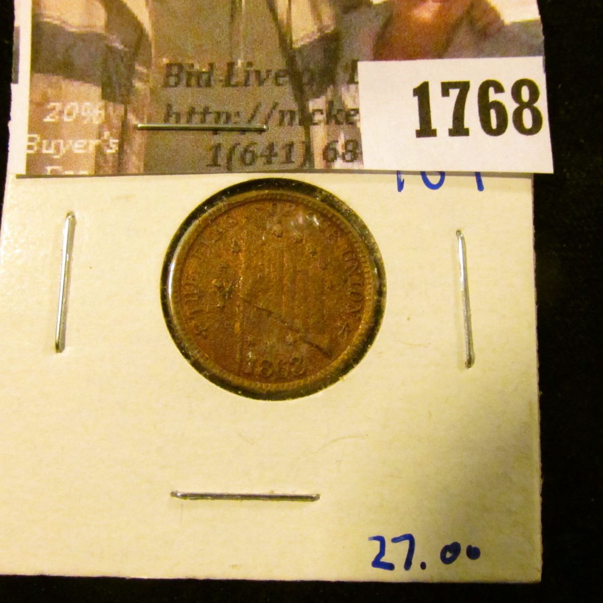 1863 Civil War Token. On The Front It Says "The Flag Of Our Union". On The Reverse It Says " If Anybody Attempts To Tear It Down Shoot Them On The Spot"