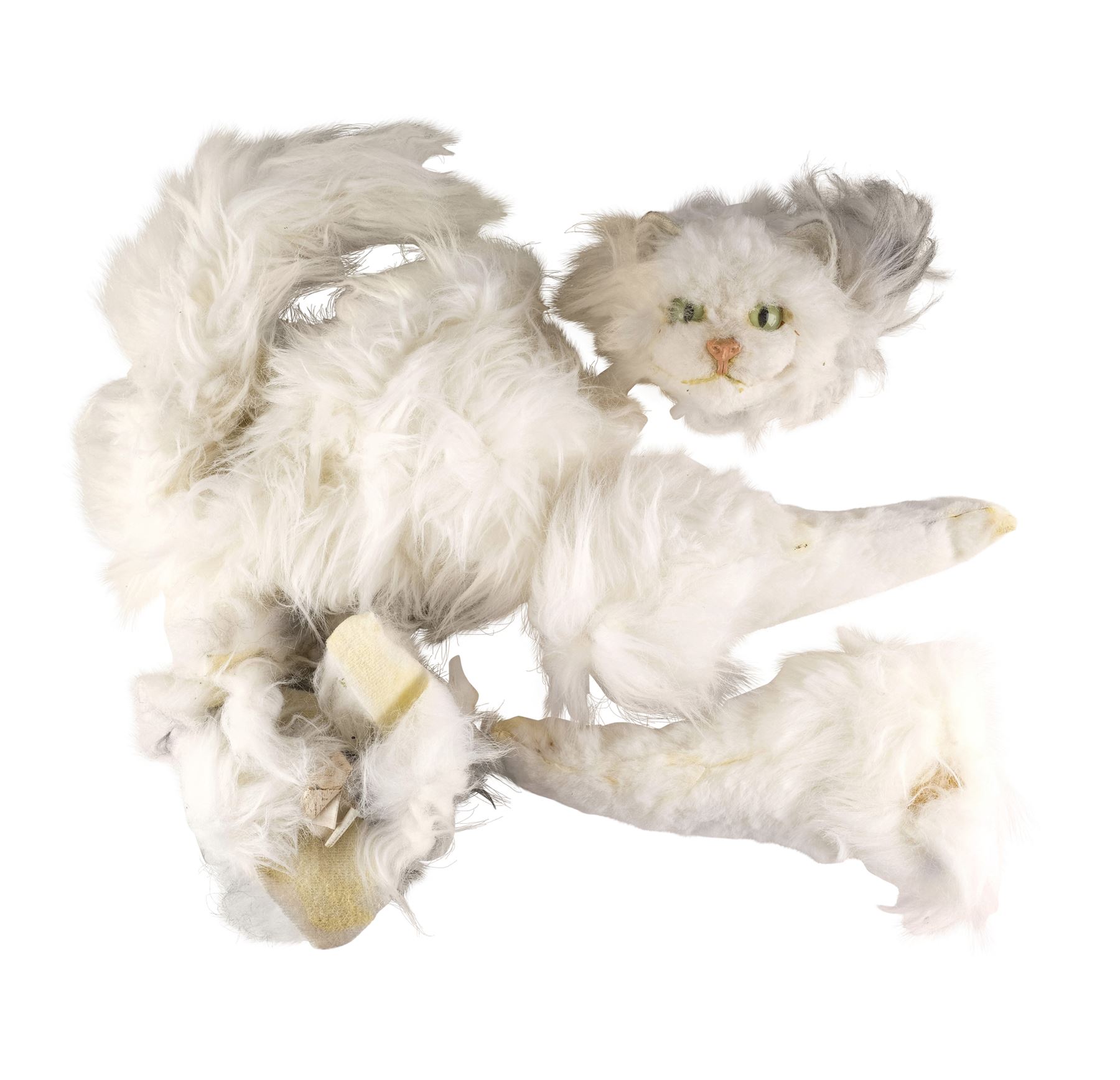 This lot consists of a gray and black painted metal Purdy Paint can with a metal and wooden base interior covering the animatronic mechanisms and cables marked "Bucket 2" and "#2" with additional annotations; and a white synthetic fur Snowbell puppet components of a foam-stuffed head, hind legs, bottom torso and tail, and fur patches. The head and the pur patches feature black paint from Snowbell being in the can. This lot exhibits grime, tape residue, and glue residue. Dimensions: 12" x 12" x 14" (30.5 cm x 30.5 cm x 35.75 cm)