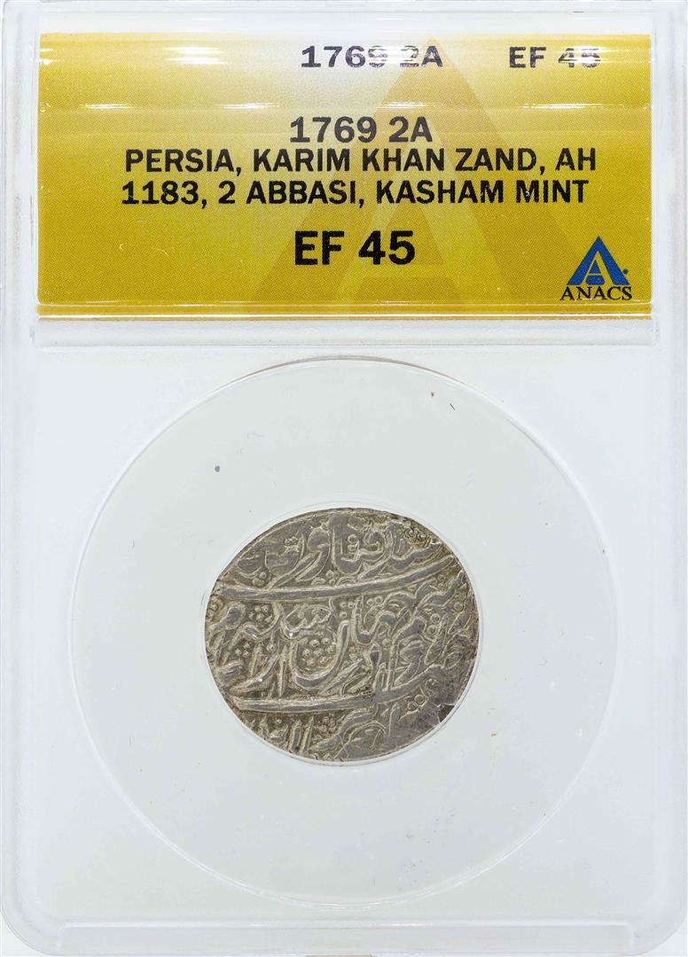 One 1769 Persia 2 Abbasi Karim Khan Zand Coin ANACS EF45. ANACS Certified.