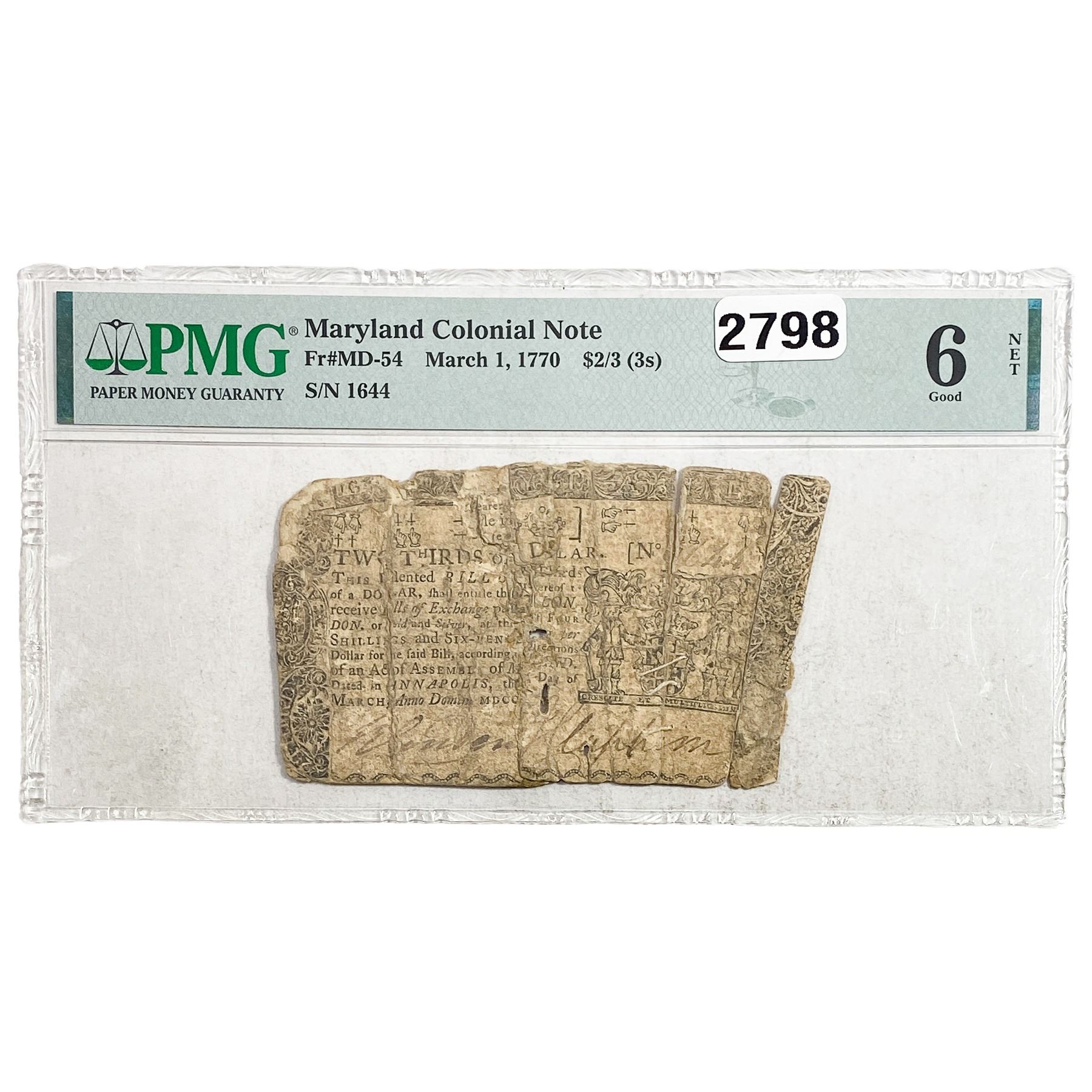 1770 $2/3 Maryland Colonial Note PMG 6 G