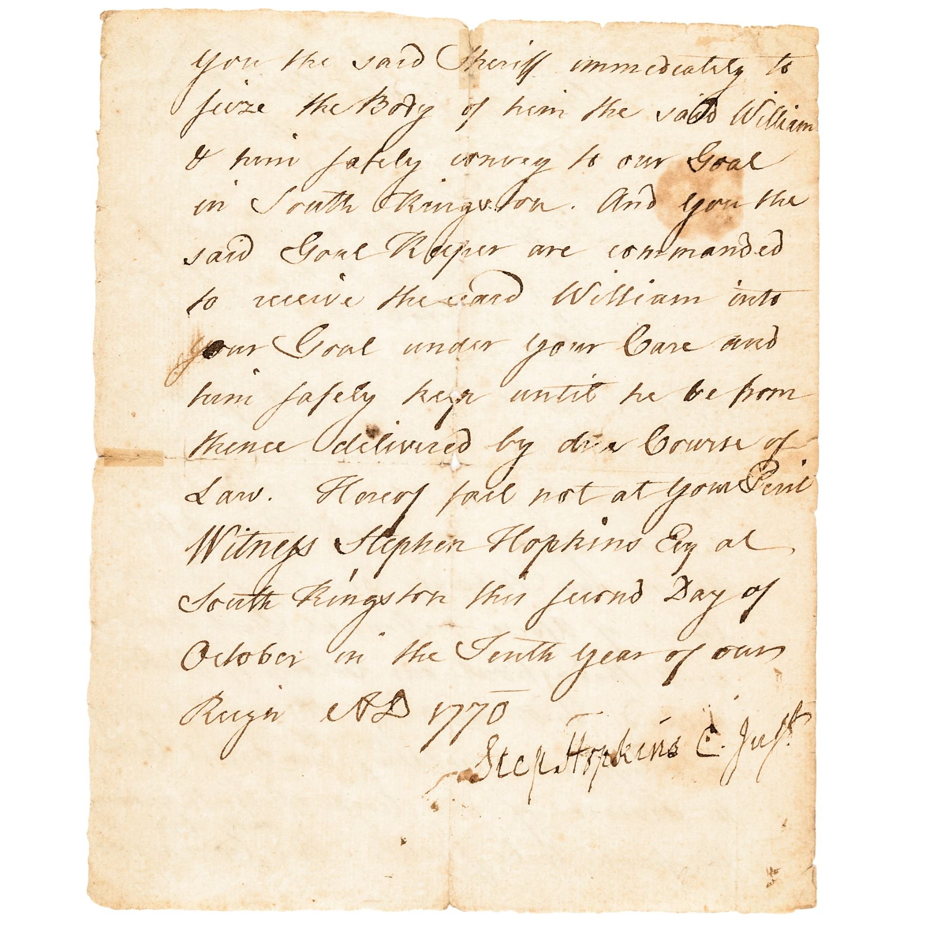 October 2, 1770-Dated Rare Colonial Period “Counterfeiting” related content Manuscript Document Signed, “Step. Hopkins” as Superior Court Judge on a Warrant for the Arrest of William Reynolds of Exeter, Kings County (now Washington County), Rhode Island, 2 pages (back to back), measuring 7.5” x 6”, Very Good. Written in bold brown ink on laid watermarked period paper, some tone and minor paper loss along the folds where worn, yet otherwise intact and with an unaffected clear signature. This important “Counterfeiting” related legal warrant reads, after the intro, in full: