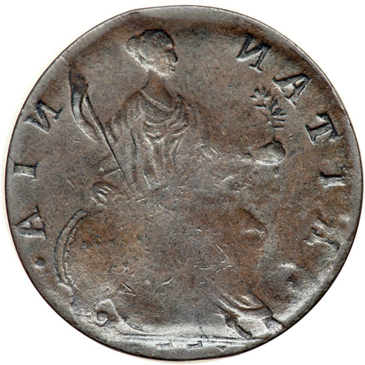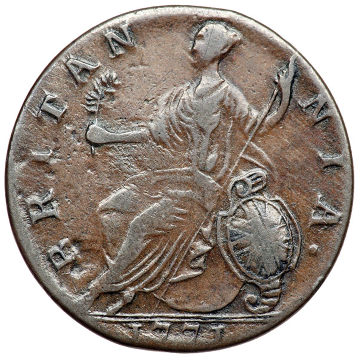 1771 Counterfeit British Halfpenny Reverse Brockage VF30. Choice glossy medium brown and light chocolate. Smooth and attractive, void of any notable defects. A reverse brockage strike with a very slightly off center incuse impression of the reverse where the obverse should have been. This occurs when a struck coin remains in the press as a new blank planchet is inserted and struck. The result is a "normal" impression on the side struck by the die and an incuse impression on the opposite side from the previously struck coin that remained in the press. A very attractive example of this type of mint error. Weight 83.0 grains.