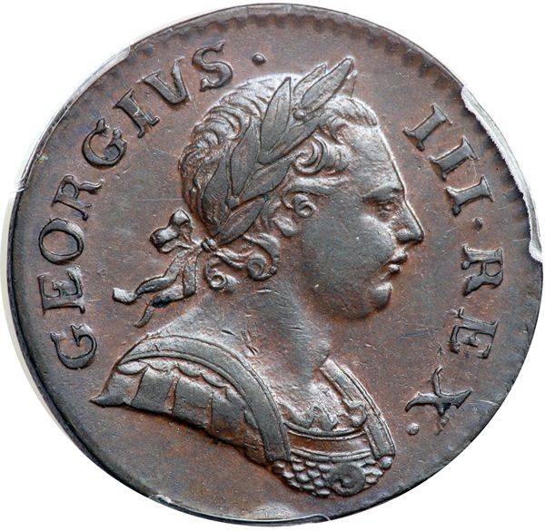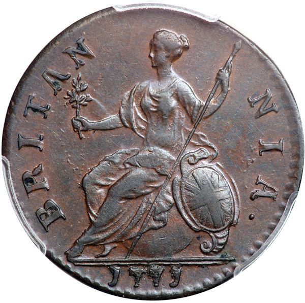 1771 Great Britain Halfpenny. PCGS graded AU-55. Choice glossy light to medium chocolate brown with darker steel toning on the highpoints and frosty lighter brown in protected areas. Outstanding eye appeal. The only defect is a barely visible rim bruise under the bust tip. Just a hint of friction on the highest points from mint state.