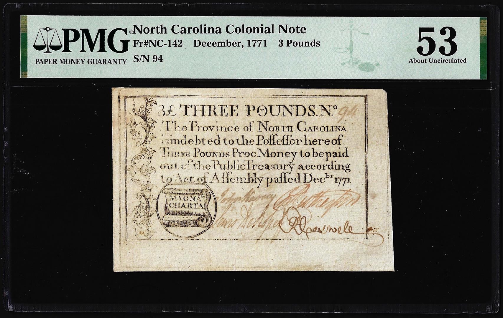 One 1771 North Carolina 3 Pounds Colonial NC-142 PMG About Uncirculated 53 Magna Charta. PMG Certified.