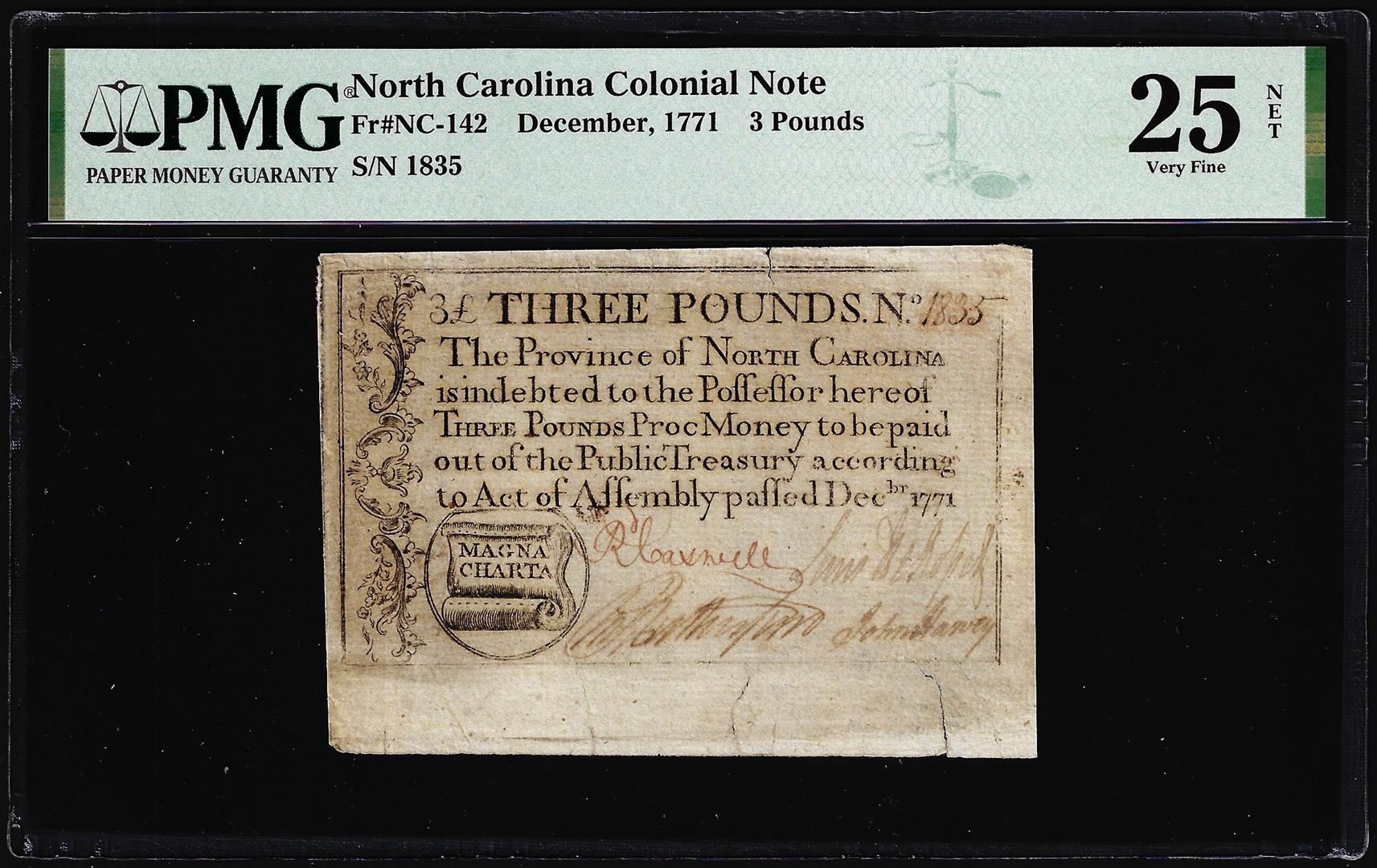 1771 North Carolina 3 Pounds Colonial Note NC-142 PMG Very Fine 25 Net Magna Charta