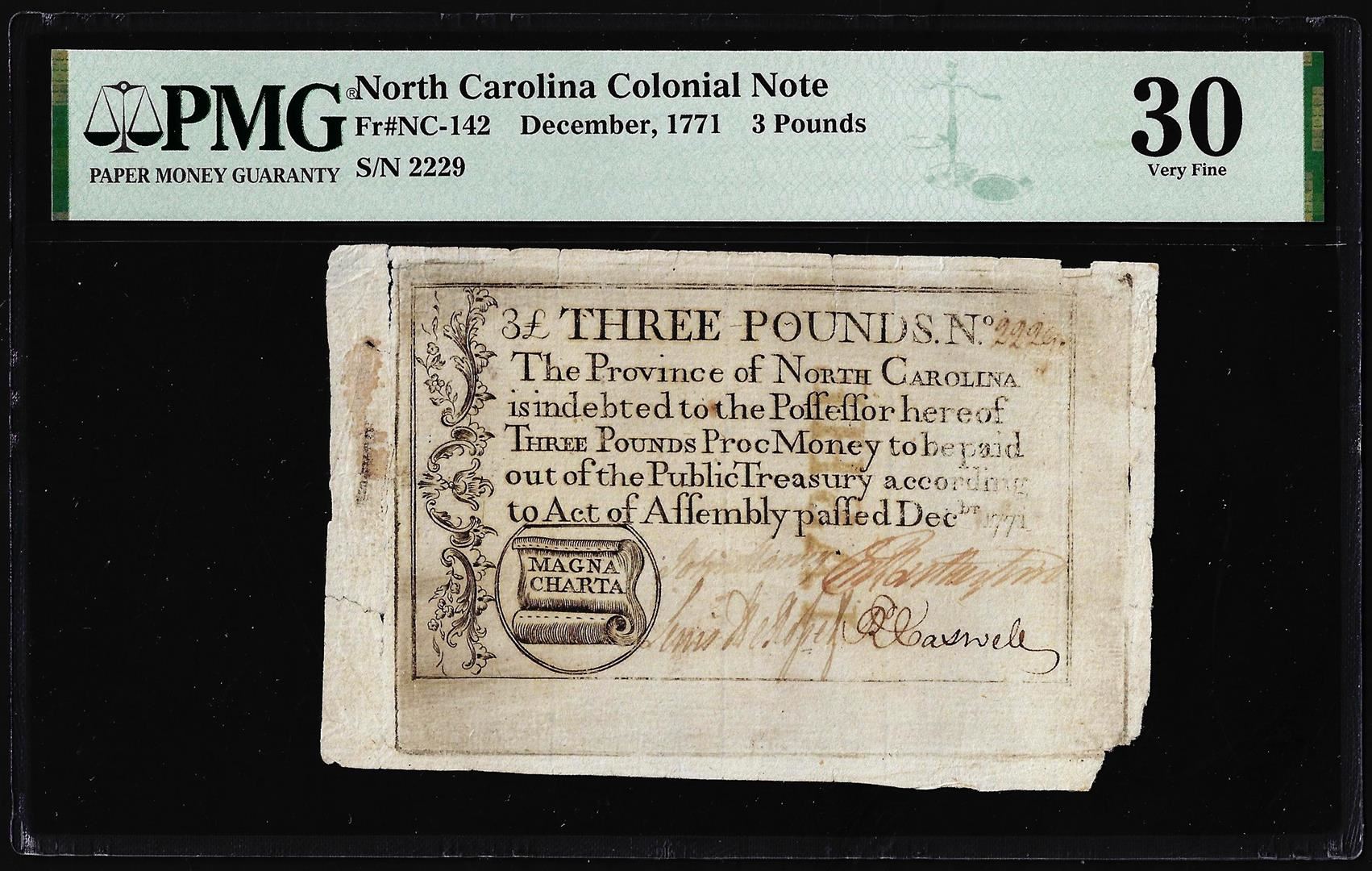 1771 North Carolina 3 Pounds Colonial Note NC-142 PMG Very Fine 30 Magna Charta