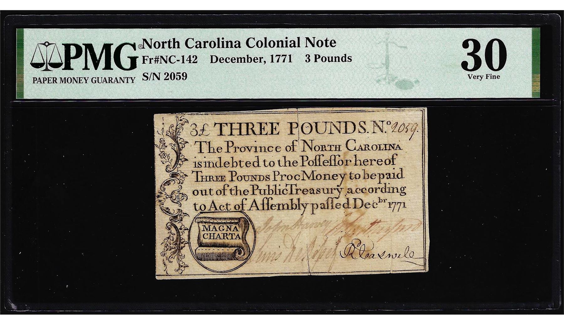 1771 North Carolina 3 Pounds Colonial Note NC-142 PMG Very Fine 30 Magna Charta