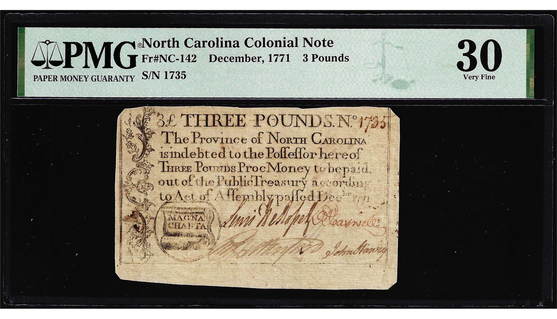 1771 North Carolina 3 Pounds Colonial Note NC-142 PMG Very Fine 30 Magna Charta