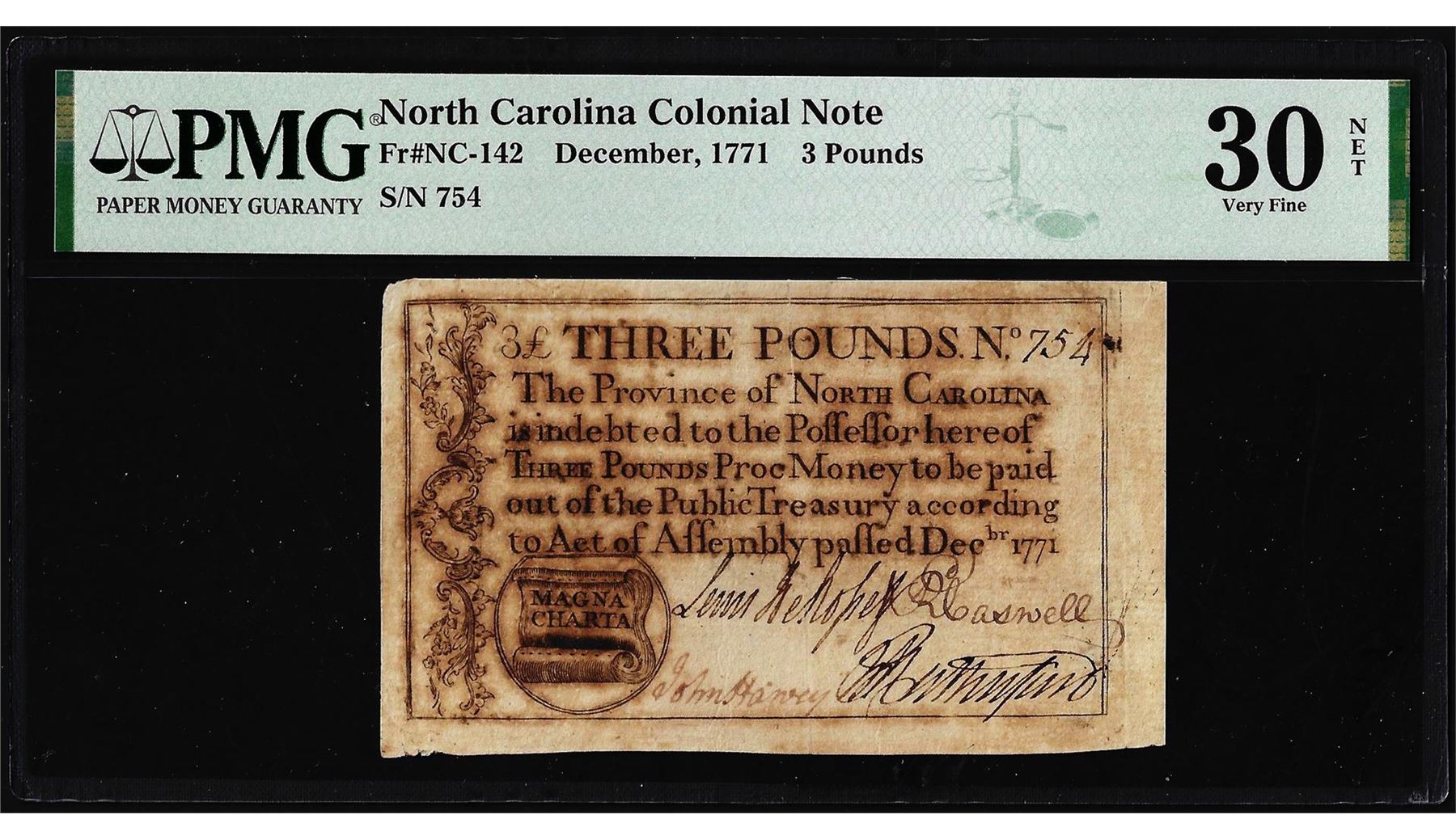 1771 North Carolina 3 Pounds Colonial Note NC-142 PMG Very Fine 30 Net Magna Charta