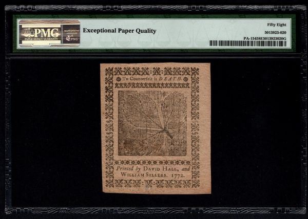 One 1772 One Shilling Pennsylvania Colonial Note PMG 58EPQ.