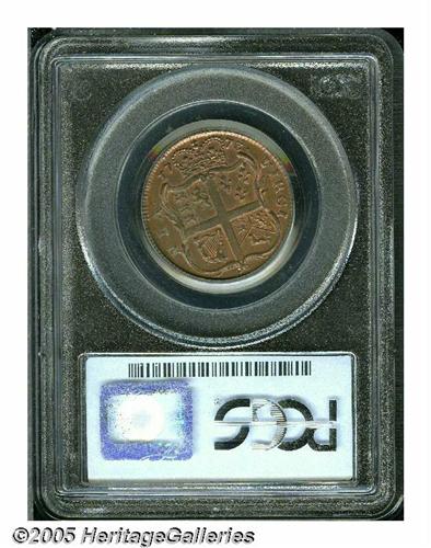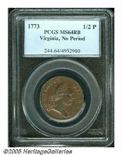 <B>1773<1/2P> Virginia Halfpenny, No Period MS64 Red and Brown PCGS.</B></I> Breen-181. Some roughness to the obverse planchet, a large die lump appears on the upper jaw, but a delightful coin, still fresh despite being more than two centuries old. Predominantly still red. Well struck, with weakness only on the front of the neck. Listed on page 30 of the 2005 <I>Guide Book.</B></I> Population: 14 in 64, 2 finer (6/05).<BR><I>From The Melrose Bay Collection.</B></I>
