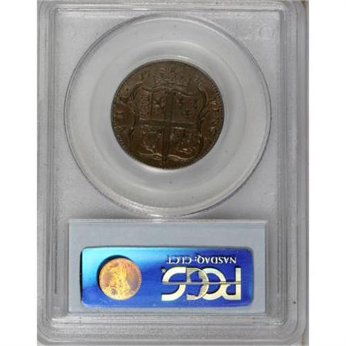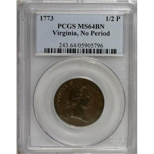 <B>1773 1/2P Virginia Halfpenny, No Period MS64 Brown PCGS.</B></I> Seven harpstrings. Newman 4-O. A well struck chocolate-brown piece with glimpses of mint red on protected areas of the reverse. A few hair-thin marks are detected near III. The reverse die is failing near the A in VIRGINIA, as made. Listed on page 43 of the 2007 <I>Guide Book.</B></I><BR><BR><b>Shipping:</b> Coins & Currency (<a target="_blank" href="http://www.heritageauctions.com/common/shipping.php">view shipping information</a>)