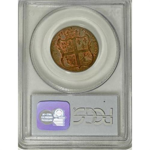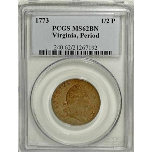 <B>1773 1/2P Virginia Halfpenny, Period MS62 Brown PCGS.</B></I> Seven harp strings. Newman 22-S. Substantial brick-red luster clings to the reverse arms. The obverse field is moderately abraded. Listed on page 43 of the 2008 <I>Guide Book.</B></I><BR><BR><b>Shipping:</b> Coins & Currency (<a target="_blank" href="http://www.heritageauctions.com/common/shipping.php">view shipping information</a>)