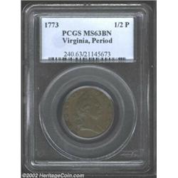 1773 1/2P Virginia Halfpenny, Period MS63 Brown PCGS. Breen-180. A needle-sharp Colonial that has smooth and unabraded chocolate-brown surfaces. A pair of small verdigris spots are near 8 o'clock on the obverse border, and the upper obverse has a retained lamination, as made. Important notice: We expect to be auctioning lots at the rate of 200-250 per hour. Sometimes eBay Premier live bid software cannot keep up with that pace, so we strongly recommend that you place a realistic proxy bid now as insurance to avoid disappointment. Also please note that all Heritage/CAA lots purchased through eBay Premier carry a 20% Buyer's Premium. Please make sure you read the Terms and Conditions.