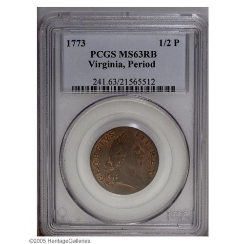 1773 1/2P Virginia Halfpenny, Period MS63 Red and Brow 1773[1/2P] Virginia Halfpenny, Period MS63 Re