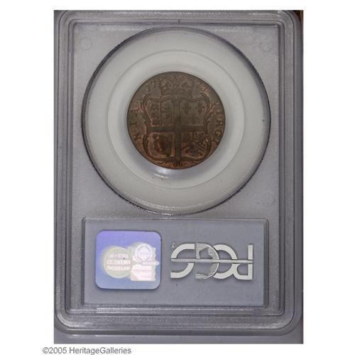 <B>1773<1/2P> Virginia Halfpenny, Period MS63 Red and Brown PCGS.</B></I> Newman 25-M. Orange-red mint color is retained about the legends and device recesses. The strike is good but not needle-sharp in the centers. A smooth piece without appreciable carbon or contact. Listed on page 43 of the 2006 <I>Guide Book.</B></I>
