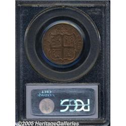 <B>1773 1/2P Virginia Halfpenny, Period MS63 Red and Brown PCGS.</B></I> Newman 23-R. Original peach-gold color is especially prominent on the reverse, although the cheek has mellowed in lilac hues. A nicely struck and unblemished example of this pre-revolution issue. Listed on page 30 of the 2005 <I>Guide Book.</B></I>
