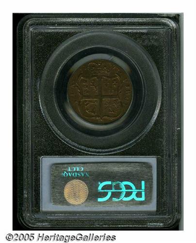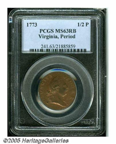 <B>1773<1/2P> Virginia Halfpenny, Period MS63 Red and Brown PCGS.</B></I> Newman 23-R. Original peach-gold color is especially prominent on the reverse, although the cheek has mellowed in tan and lilac hues. A nicely struck and unblemished example of this pre-revolution issue. Listed on page 30 of the 2005 <I>Guide Book.</B></I>