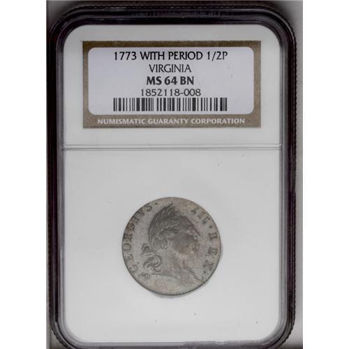 1773 1/2P Virginia Halfpenny, Period MS64 Brown NGC. N 1773[1/2P] Virginia Halfpenny, Period MS64 Br