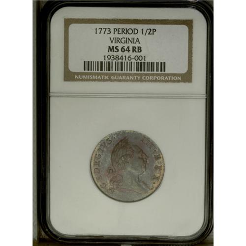 <B>1773 1/2P Virginia Halfpenny, Period MS64 Red and Brown NGC.</B></I> Seven harp strings. Newman 27-J. Lovely silver-blue, rose-red, and gold patina embraces this nicely struck, shimmering, and unblemished example. Listed on page 43 of the 2007 <I>Guide Book.</B></I><BR><BR><b>Shipping:</b> Coin/Currency (<a target="_blank" href="http://www.heritageauctions.com/common/shipping.php">view shipping information</a>)