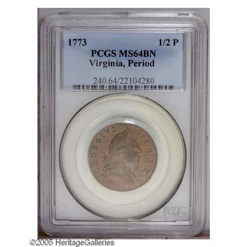 1773 1/2P Virginia Halfpenny, Period MS64 Brown PCGS. 1773[1/2P] Virginia Halfpenny, Period MS64 Bro