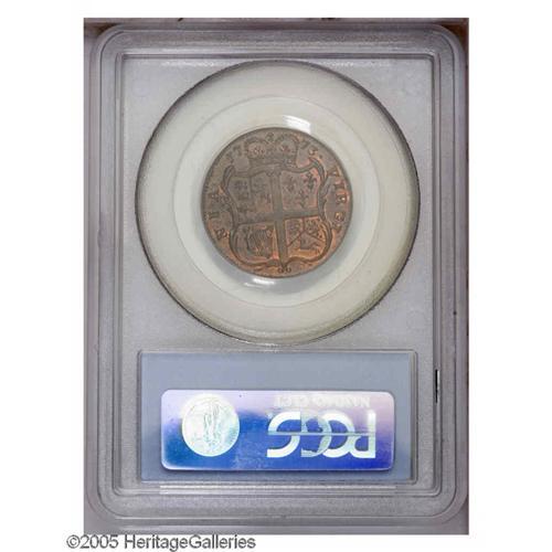 <B>1773<1/2P> Virginia Halfpenny, Period MS64 Brown PCGS.</B></I> Newman 25-M. 7 harp strings. Glimpses of mint red color are noted on portions of the reverse, especially the lower quadrants of the shield. The obverse is mostly golden-brown, although deeper steel-gray toning is on the cheek and the minutely granular upper left reverse. Listed on page 43 of the 2006 <I>Guide Book.</B></I>