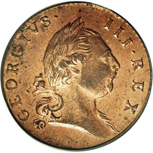 <B>1773<1/2P> Virginia Halfpenny, Period MS64 Red PCGS.</B></I> Eight harp strings. Newman 26-Y. Although Mint State Virginia halfpennies are not particularly rare, few among those pieces can boast full Red color. The cheek and bust truncation of King George III shows gunmetal-gray tints, but copper-red dominates the fields. No marks of any consequence are present. Population: 22 in 64, 1 finer (4/06).