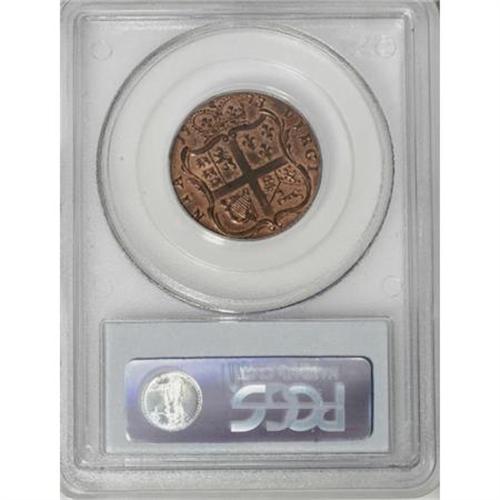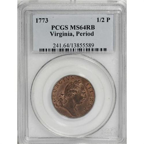 <B>1773 1/2P Virginia Halfpenny, Period MS64 Red and Brown PCGS.</B></I> Newman 25-M. From the Eliasberg collection, although undesignated as such on the PCGS insert. The reverse is nearly full red, and the obverse also has considerable orange luster. The king's cheek and neck are toned brown. A pleasing example of this authorized pre-revolutionary issue. Listed on page 43 of the 2008 <I>Guide Book.<BR>Ex: Louis E. Eliasberg, Sr. Collection (Bowers and Merena, 5/96), lot 40.<BR>From The Madison Collection.</B></I><BR><BR><b>Shipping:</b> Coins & Currency (<a target="_blank" href="http://www.heritageauctions.com/common/shipping.php">view shipping information</a>)