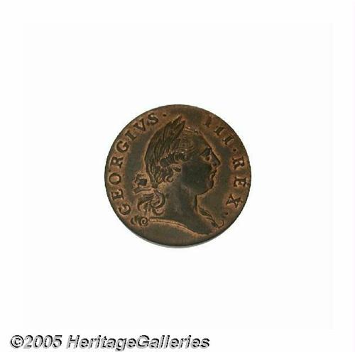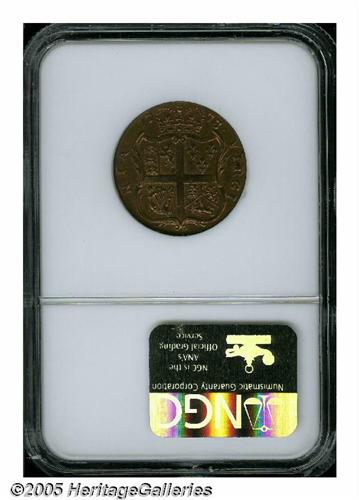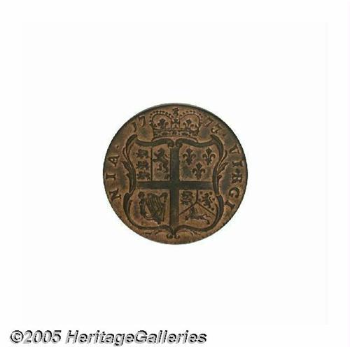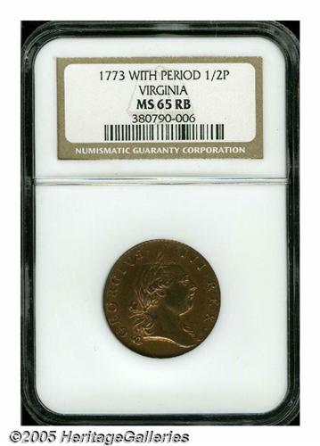 <B>1773<1/2P> Virginia Halfpenny, Period MS65 Brown NGC.</B></I> Newman 25-M. Bright original gold color is especially pervasive on the reverse. The cheek, neck, and obverse field have acquired medium brown toning. A well struck and beautifully preserved Gem, worthy of a high quality Early American type collection. Struck from clashed dies. Listed on page 30 of the 2005 <I>Guide Book.</B></I>