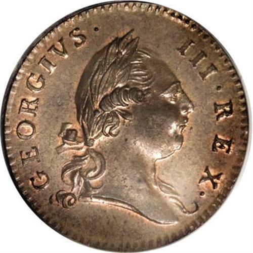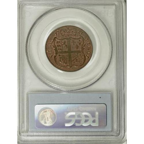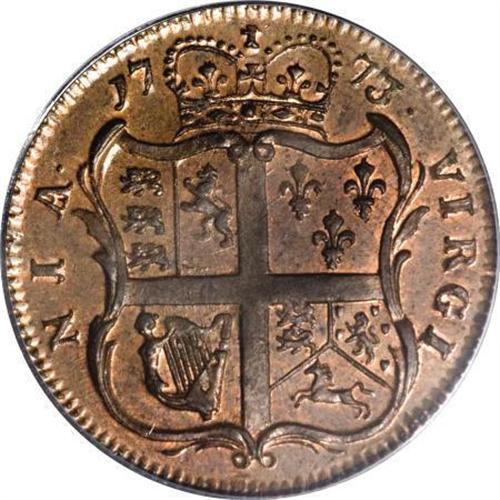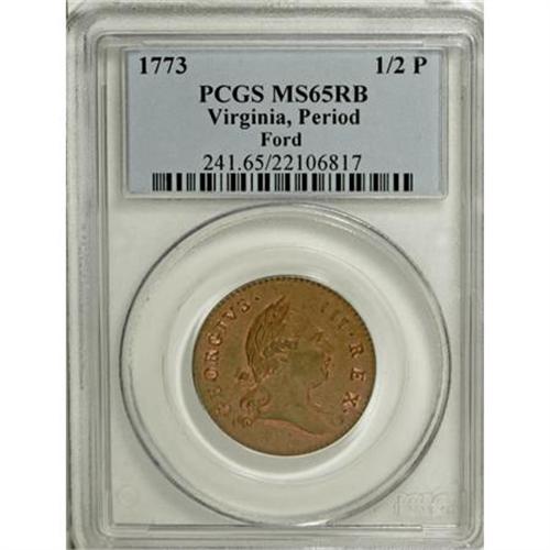<B>1773 1/2P Virginia Halfpenny, Period MS65 Red and Brown PCGS.</B></I> Ex: Ford. Seven harp strings. Newman 27-J. 128.8 grains. A sharply struck and beautiful Gem with noticeable brick-red luster about the letters and shield. Struck on a broader flan than is usual for the series. Listed on page 43 of the 2008 <I>Guide Book.</B></I> Population: 5 in 65, 1 finer (7/06).<BR><I>Ex: John J. Ford, Jr. Collection, Part VII (Stack's, 1/05), lot 119.</B></I><BR><BR><b>Shipping:</b> Coins & Currency (<a target="_blank" href="http://www.heritageauctions.com/common/shipping.php">view shipping information</a>)